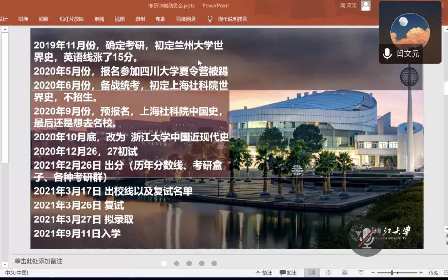 为了进一步提高樱花小说 学生的考研热情,明确考研目标,掌握考研技巧,2021年11月6日晚,樱花小说 2021年就业服务系列活动之校友考研经验云分享在腾讯会议上准时举行。本次活动有幸邀请到已经考研上岸的17中文1班卢彦如学姐、17历本闫文元学长、17创中厉子聪学长以及17广告张江科学长分享各自考研经验。