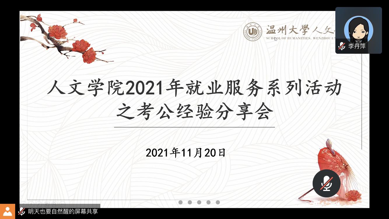 为了更好地助力大家的公考之路,提前做好规划和准备,2021年11月20日晚上18:30,樱花小说 2021年就业服务系列活动之校友考公经验云分享在腾讯会议如期举行。