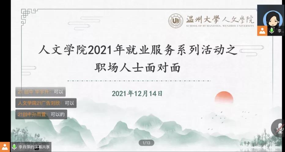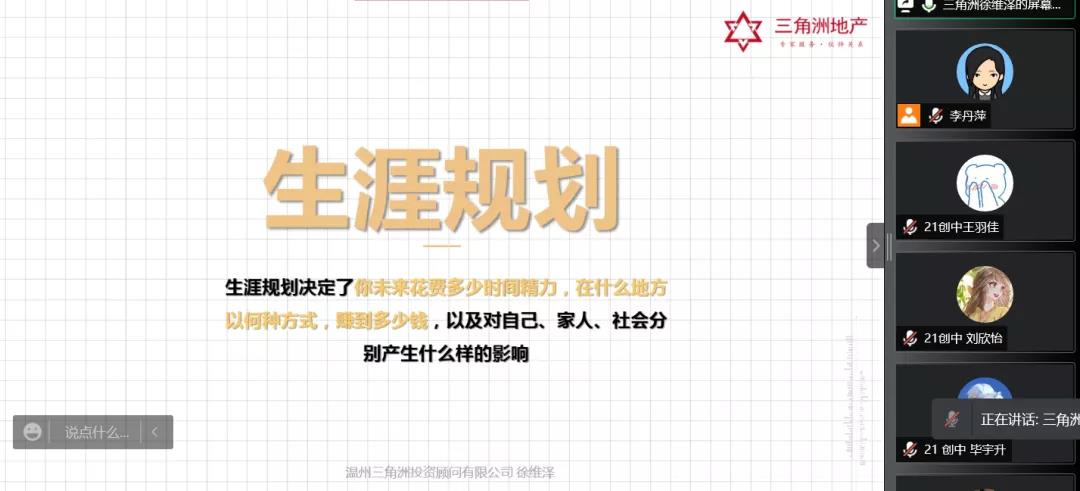 为明确同学们的职业规划方向和职业发展成长路径,2021年12月14日下午,樱花小说 邀请温州三角洲投资顾问有限公司人力资源经理徐维泽和策划经理张舒乐,在腾讯会议上为大家分享职业规划和职场上的那些事儿。