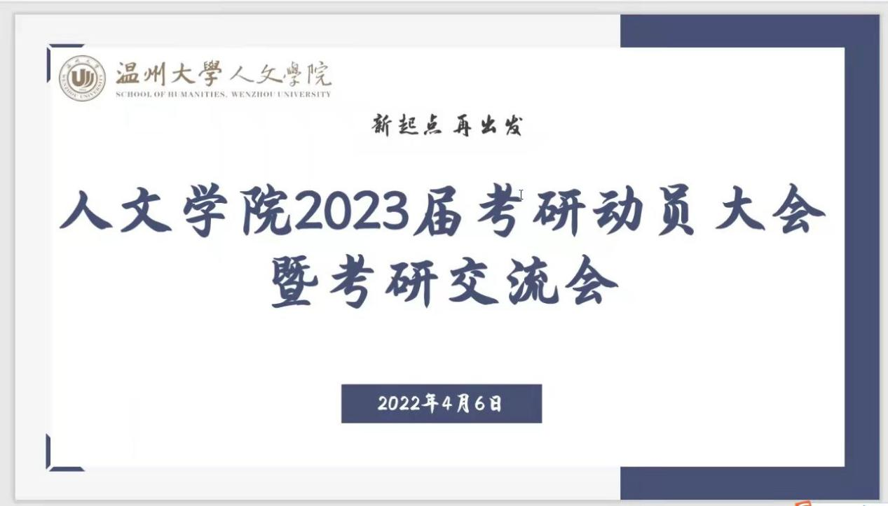 为了充分调动同学们的考研积极性,明确考研目标与方向,更好挖掘自身潜能,2022年4月6日下午,樱花小说 举办了2023届考研动员大会暨考研交流会。根据疫情防控要求,本次大会采取了线上线下相结合的方式,线下地点为人文楼213会议室,同时开启腾讯线上视频会议。樱花小说 党委副书记魏一、院学工办辅导员李丹萍、四位优秀研究生代表以及意向考研的同学共200余人参会。
