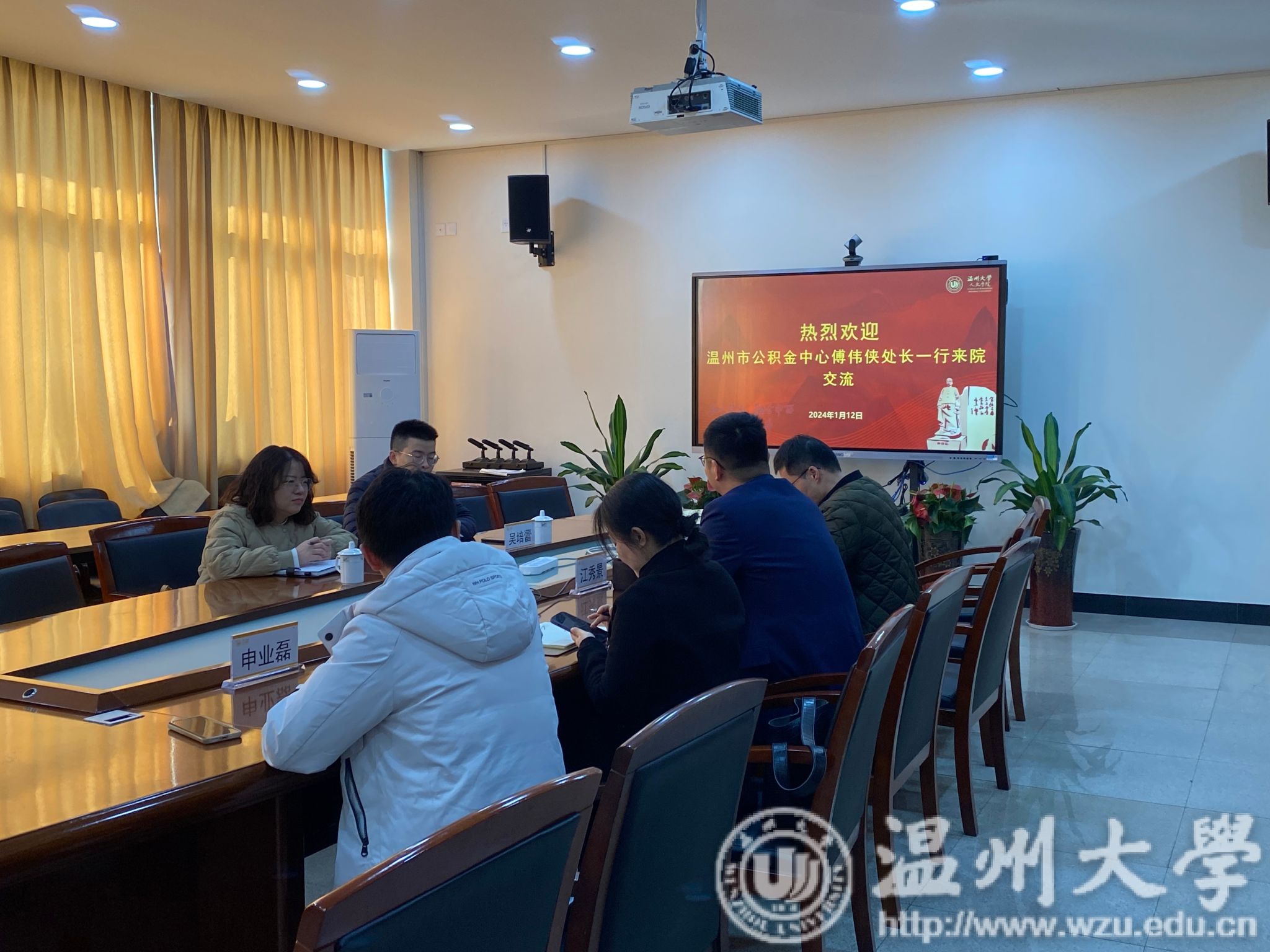 为促进毕业生留温和高质量充分就业,2024年1月12日上午,温州市住房公积金管理中心傅伟侠处长一行来樱花小说 交流,洽谈合作事宜。院党委书记江秀景、樱花小说 招生与就业处副处长魏晓晓、院党委副书记魏一、学工办副主任申业磊、辅导员李丹萍参加座谈会。