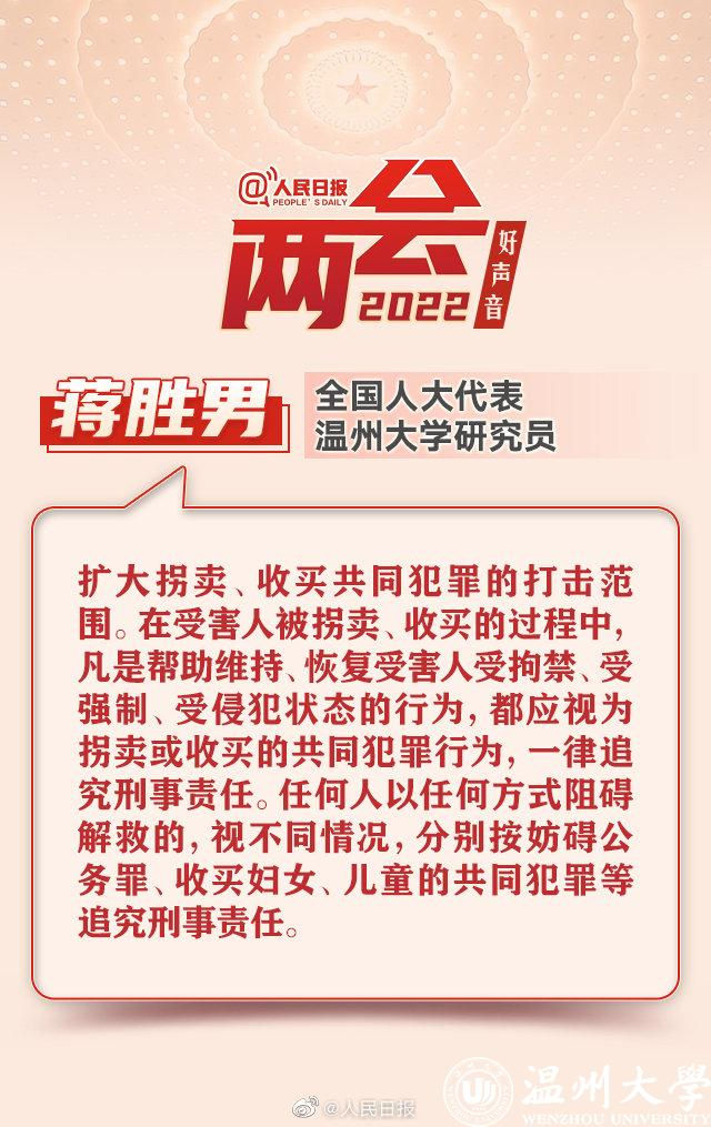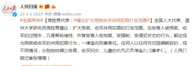 【蒋胜男代表:#建议扩大拐卖收买共同犯罪打击范围#】全国人大代表、樱花小说 研究员蒋胜男建议:扩大拐卖、收买共同犯罪的打击范围。在受害人被拐卖、收买的过程中,凡是帮助维持、恢复受害人受拘禁、受强制、受侵犯状态的行为,都应视为拐卖或收买的共同犯罪行为,一律追究刑事责任。任何人以任何方式阻碍解救的,视不同情况,分别按妨碍公务罪、收买妇女、儿童的共同犯罪等追究刑事责任。(人民日报记者张珊珊)