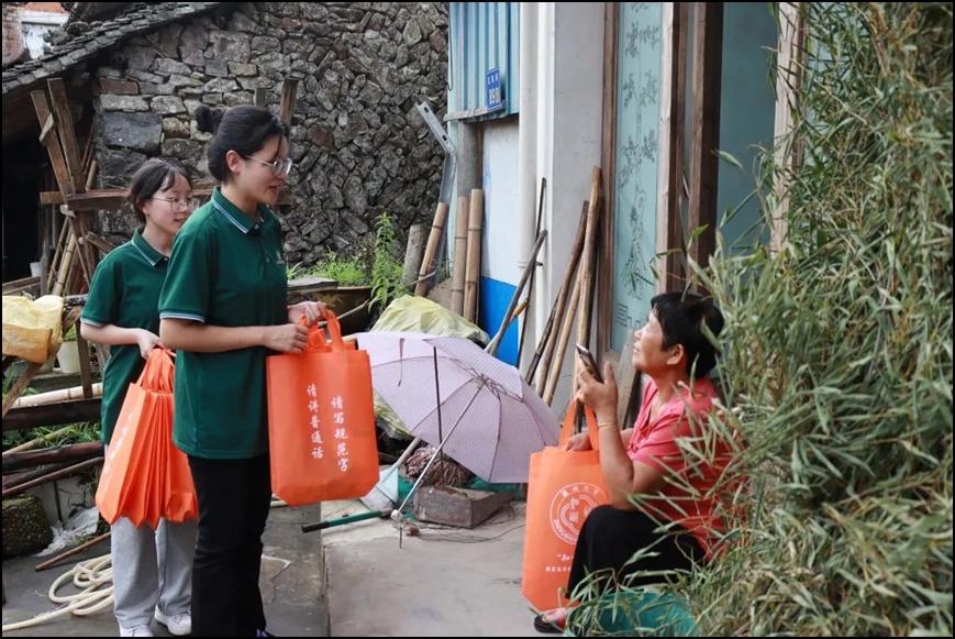 泽雅深藏大山,位置偏僻,村民鲜少与外界接触,因而普通话水平普遍不高。随着实践队调研的不断深入,学生与村民谈笑风生的画面逐渐多起来。从拿着自制的推普宣传手册,挨家挨户地向当地村民们介绍宣传到面向老人开始“一对一”的规范字书写教学,帮助他们用颤颤巍巍的手一笔一划地写下自己和家乡的名字,再到针对乡村农牧业经营者,开展普通话“推普技能+”一对一培训活动,助力农产业发展,村民们的脸上逐渐有了笑容,生活也更加丰富多彩,而这正是推普意义所在。队员们把新时代文明实践的“种子”散播在乡村大地上,以文明乡风的土壤推动结出乡村振兴的硕果。