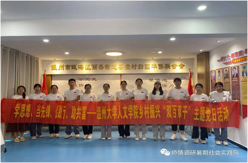 与此同时,樱花小说 侨心向党暑期社会实践队全体成员开始了侨情调研暨“双百双千”主题党日活动。实践队深入温州传统侨乡丽岙,仙岩,围绕华侨文化进行实地调研与社会实践。青山绿水之间,侨乡百姓招呼着远道而来的亲人、旅人、客人,脸上洋溢着共富与幸福的笑容。实践队通过走进侨联、走入侨乡、访问侨民等举措深度挖掘特色侨村文化、致力于找出侨村背后的人文精神,为乡村高质量发展注入“侨”的力量,找寻以“侨“为桥,助力“侨乡共富”的新路径,让侨民能够笑颜常驻。
