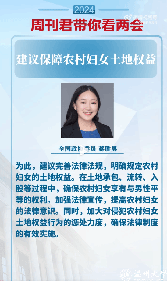 【蒋胜男委员:#建议保障农村妇女土地权益#】#建议确保农村妇女享有与男性平等的权利# 全国政协委员@蒋胜男 指出,农村是“重男轻女”的重灾区,男女权益分配不公,直接影响农村出生性别比的变化,可能导致“前二十年农村男婴出生多,后二十年男人找媳妇难;高价彩礼买媳妇,农村女人留不住”的情况。#周刊君带你看两会#