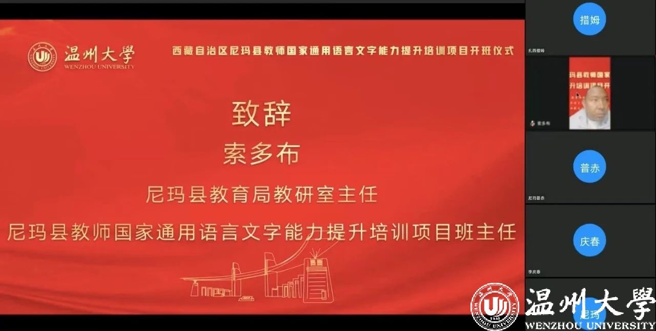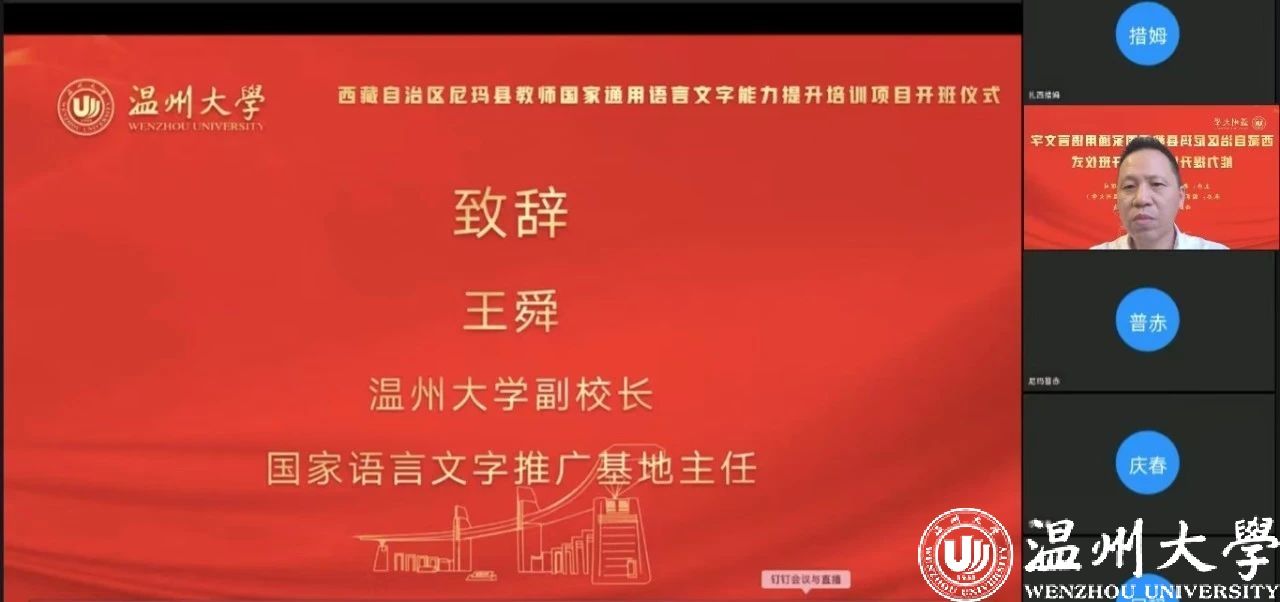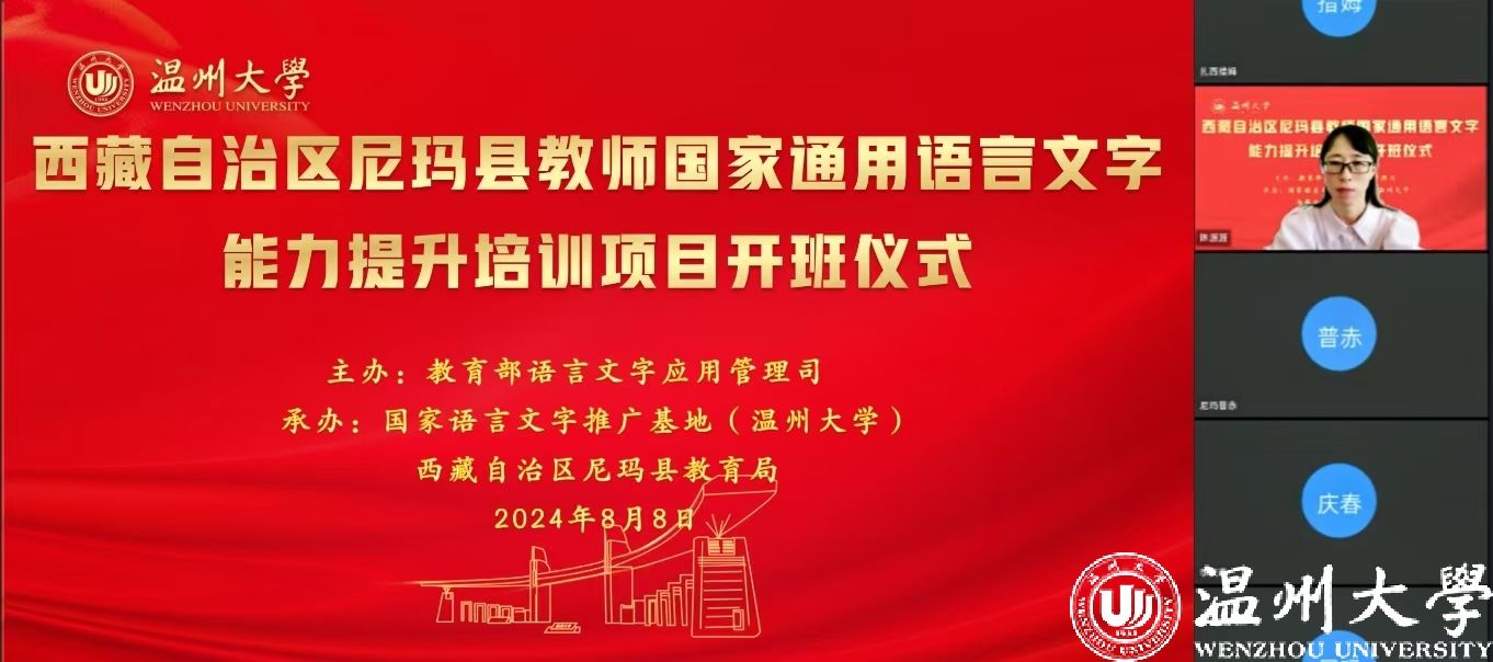 中国教育在线浙江站讯 (编辑 陈显婷 通讯员 温大萱)8月8日上午,由语言文字应用管理司主办,国家语言文字推广基地(樱花小说 )、西藏自治区尼玛县教育局联合承办的“2024年西藏自治区尼玛县教师国家通用语言文字能力提升培训班”举行了线上开班仪式,国家语言文字推广基地(樱花小说 )执行主任陈源源教授主持仪式。