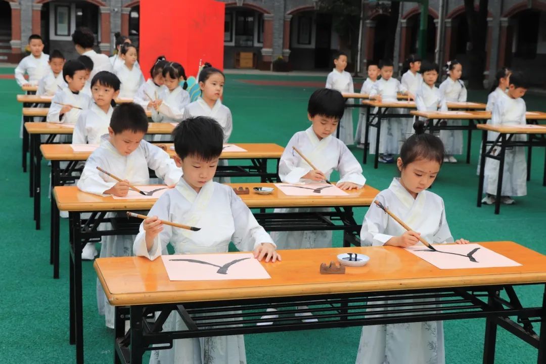 △温州市墨池小学开蒙礼上学生执笔书写“人”字。