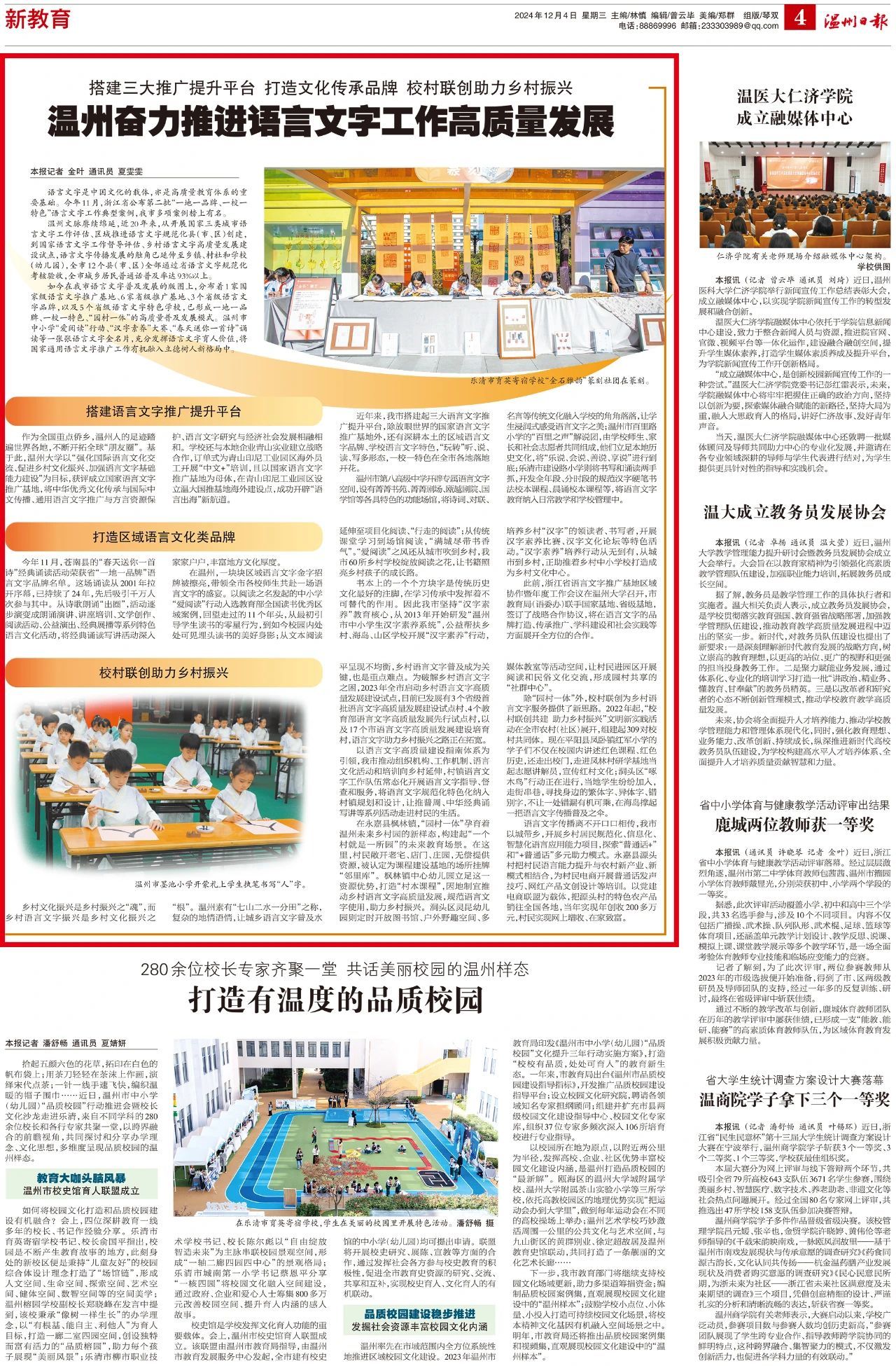 温州市第八高级中学开辟专属语言文字空间,设有菁菁书苑、菁菁剧场、瓯越剧院、国学馆等各具特色的功能场馆,将诗词、对联、名言等传统文化融入学校的角角落落,让学生浸润式感受语言文字之美;温州市百里路小学的“百里之声”解说团,由学校师生、家长和社会志愿者共同组成,他们立足本地历史文化,将“乐说、会说、善说、享说”进行到底;乐清市建设路小学则将书写和诵读两手抓,开发全年段、分时段的规范汉字硬笔书法校本课程、晨诵校本课程等,将语言文字教育纳入日常教学和学校管理中。