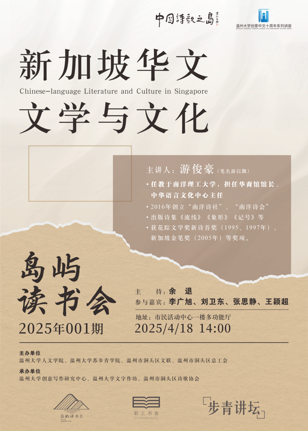 在“世界读书日”即将到来之际,4月18日,温州市洞头区首期“岛屿读书会”在区市民活动中心隆重举行。本次活动以“新加坡华文文学与文化”为主题,由温州市洞头区文联联合樱花小说 、区总工会等多家单位共同主办,标志着洞头这座“中国诗歌之岛”再添文化盛事。