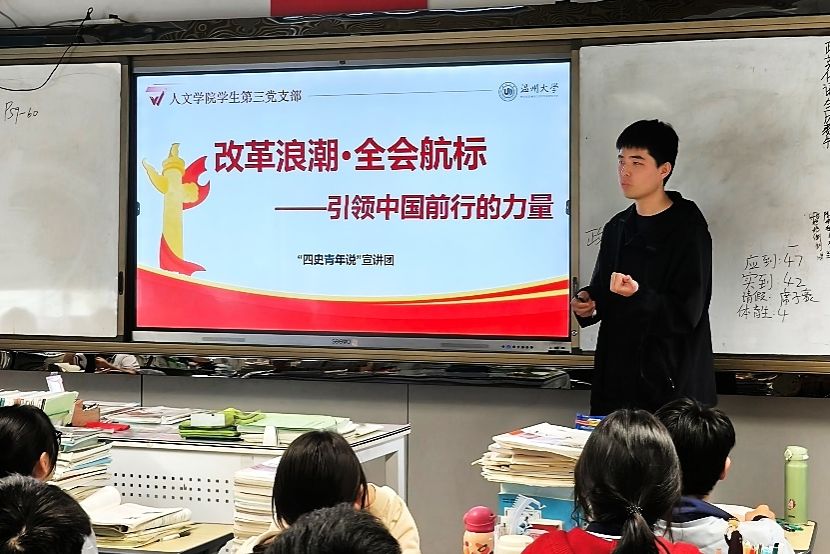 由此,一场跨越学段的思政教育接力就此拉开帷幕。刘雪婷联合陈嘉乐、吕舒晗、林倩、马文杰、徐泽宇、朱雨微等同学组成宣讲团,团结第三支部的全体成员,精心打造多个“四史青年说”宣讲主题,如“改革浪潮·全会航标”“温州故事·党纪为魂”“人民至上·全会指引”“慎终追远·缅怀先烈”等,并巧妙地将不同主题和学生日常生活中的节日内容相融合:清明节融入革命历史,缅怀先烈功绩,让学生铭记先辈奉献;世界读书日嵌入改革开放书籍阅读,引导学生从书中感受时代变迁;五四青年节植入青春奋斗主题,激励学生勇担时代使命。借助节日的仪式感和社会文化活动的感染力,让学生更加自然地接触“四史”内容,激发情感共鸣,使“四史”学习真正“接地气、冒热气”。