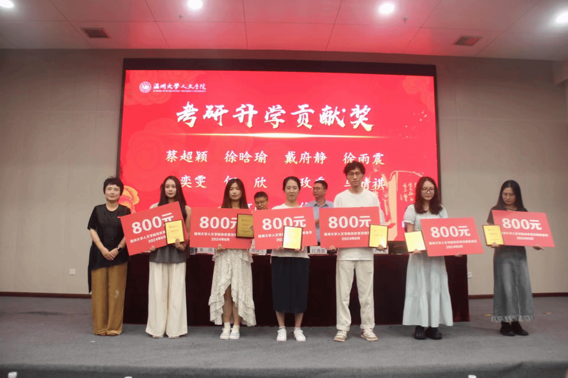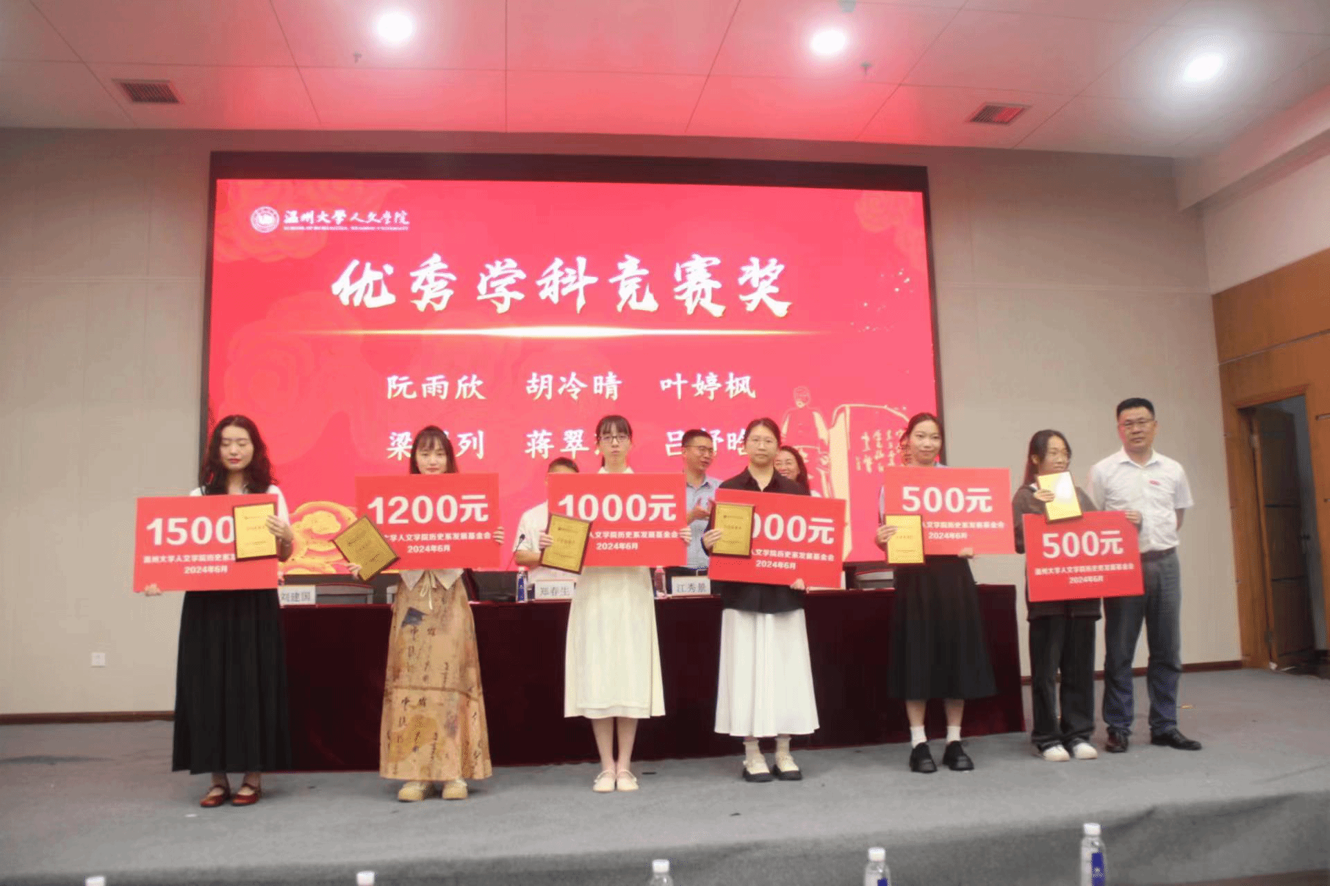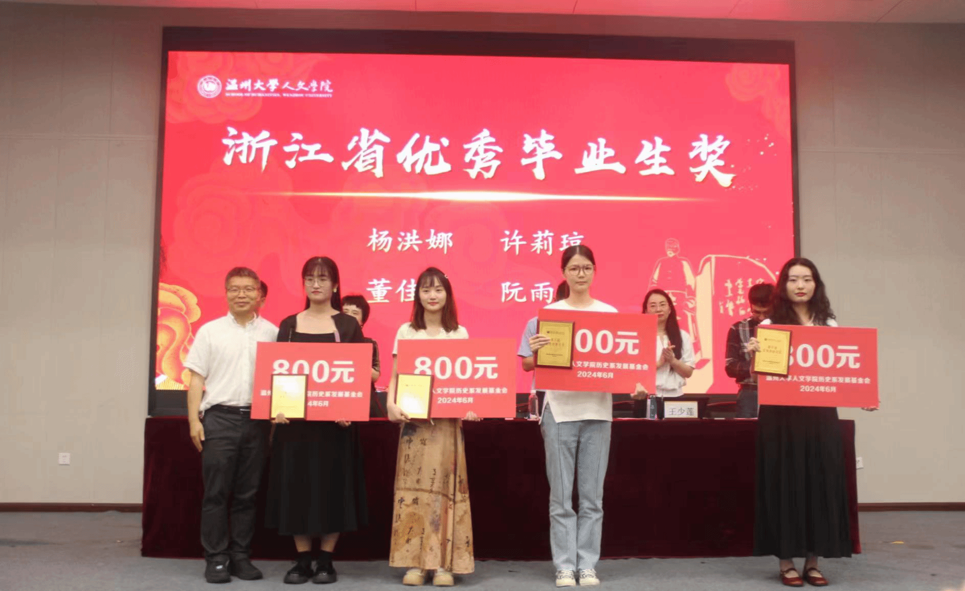 院党委副书记黄玮宣读获奖名单,分别是优秀毕业论文奖、优秀学科竞赛奖、考研升学贡献奖、浙江省优秀毕业生奖、教师特别贡献奖。陈鸿超老师宣读了通报表扬名单。获奖师生依次上台领奖。