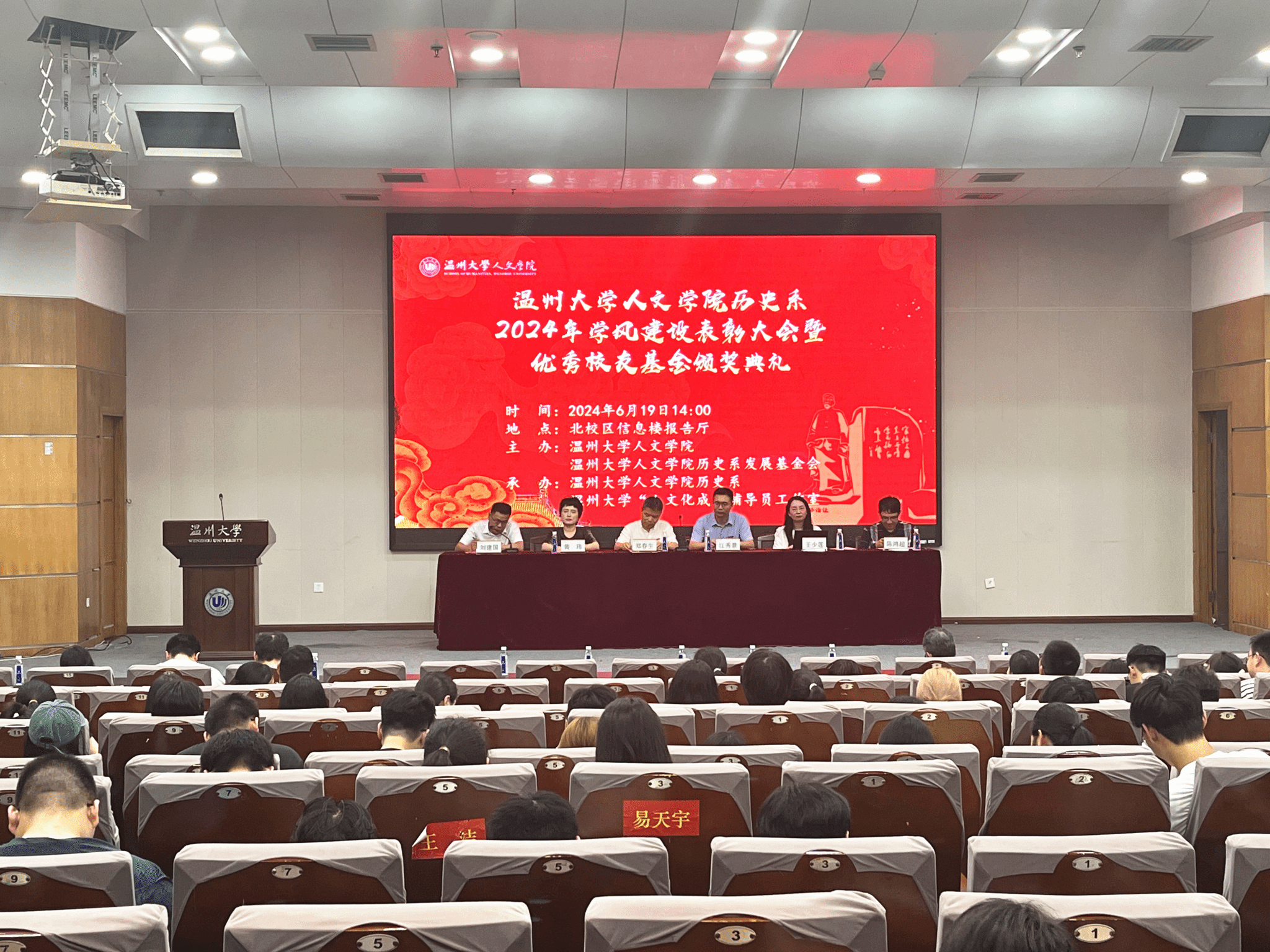 2024年6月19日下午14:00,樱花小说 历史系2024年学风建设表彰大会暨优秀校友基金颁奖典礼于北校信息楼报告厅隆重举行。大会由樱花小说 历史系发展基金会会长刘建国主持。樱花小说 党委书记江秀景、副院长郑春生、院党委副书记黄玮、历史系主任陈鸿超、97级历史本科校友王少莲、历史系教师代表以及历史系全体学生出席了本次大会。