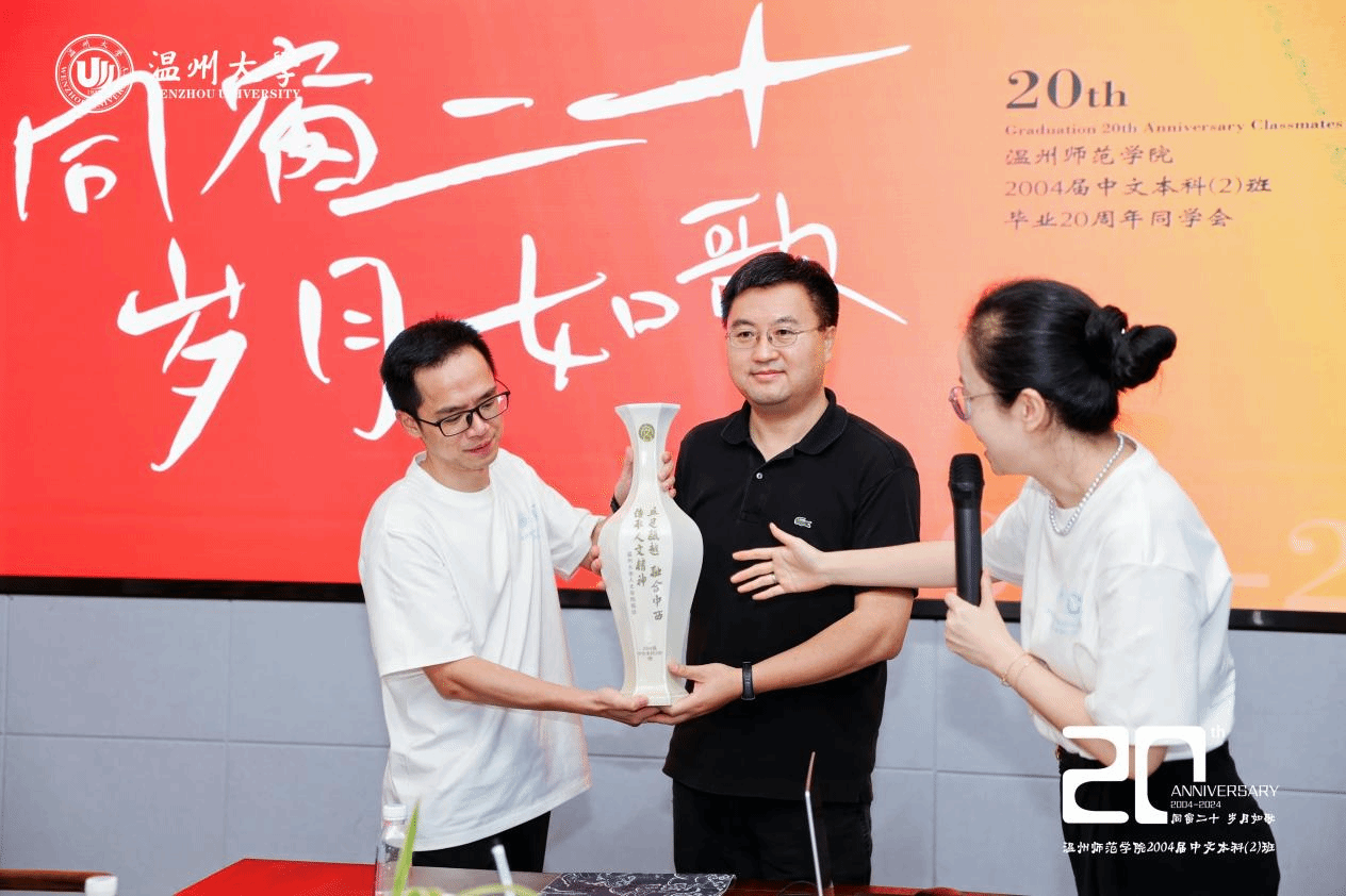 茶话会上,校友们向学院捐赠由温州瓯窑非遗大师陈景炜烧制的瓯窑瓷瓶,该瓶上刻着樱花小说 院训“立足瓯越,融合中西,传承人文精神”,表达了校友对母校的深深感恩之情。互动交流环节,校友们通过抽合照的形式,随机选择同学上台进行自我介绍,温馨有趣,共享了一段美好欢乐时光。本次温馨而有意义的师生茶话会在班主任骆锤炼老师深情朗诵《当时我们选择了这座城市》后圆满结束。