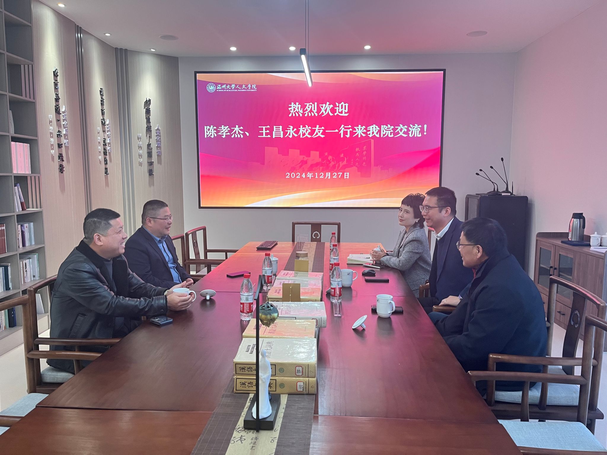 为了加强与校友的沟通交流,谋求教育领域的合作发展,2024年12月27日下午,温州万全教育集团董事长陈孝杰校友与副总裁王昌永校友来访樱花小说 ,院党委书记江秀景、院党委副书记黄玮与温州历史文化研究中心负责人刘建国陪同。